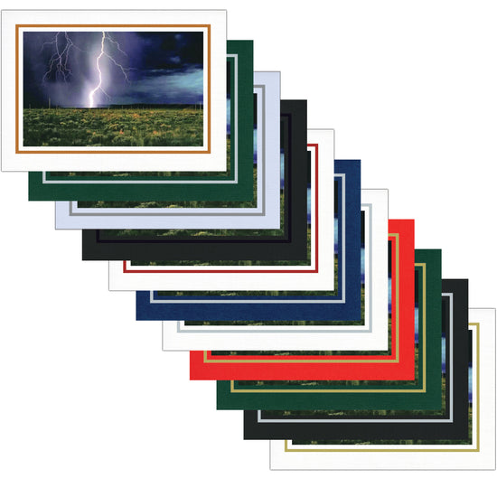Includes all 11 Foil Border Cards (#1527-Gold Foil on Snow White Linen, #1555-Silver Foil on Deep Blue, #1574-Silver Foil on Snow White Linen, #1526-Gold Foil on Red Pepper Linen, #1556-Silver Foil on Black Linen, #1550-Gold Foil on Pine Green Linen, #1575-Red Foil on Snow White Linen, #1576-Black Foil on Black Linen, #1599-Silver Foil on Baby Blue Linen, #1613-Cpooer Foil on Snow White Linen and #1614-Silver Foil on Pine Green Linen). A great way to sample all the Foil Border Cards we have to offer!