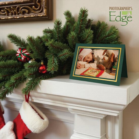 Add a festive flourish to your memories with these Pine Green Linen holiday cards. The Gold Foil border sparkles like holiday lights, framing your 4” x 6” photos in warmth and elegance. Think snowy family portraits, cozy pet pictures, or golden autumn leaves—the possibilities are endless! No matter what scene you may be showcasing, the rich green linen frame complements a variety of colors and tones. Each photo insert card measures 5” x 7” and includes a spacious blank back for personal messages. With their flexible design, these cards work equally well for horizontal or vertical photos, making them a go-to choice for all your seasonal sending needs.