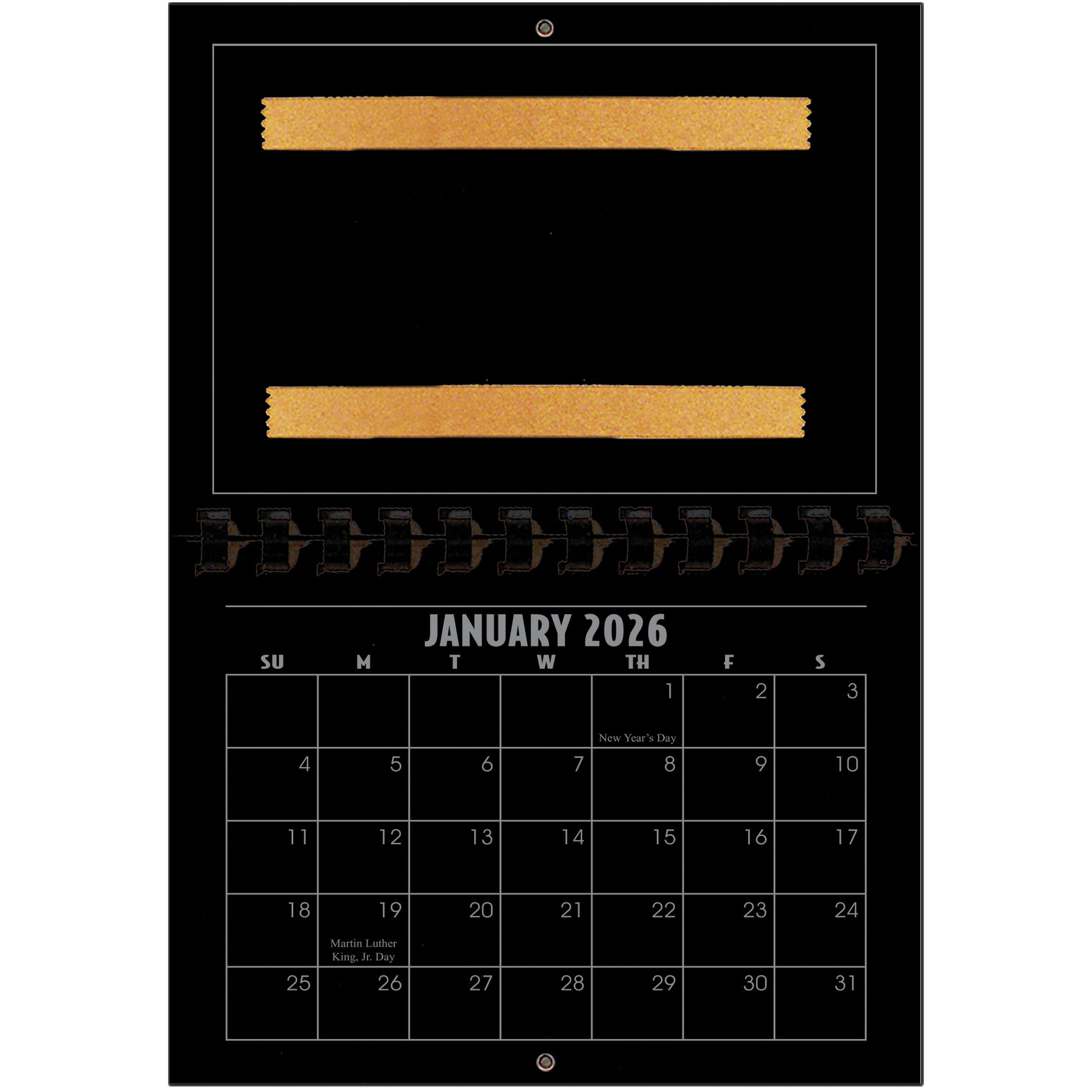 Turn your photos into calendars! Each one allows you to use 13 of your 4' x 6' horizontal photos. Printed with soybean based Silver ink on recycled Black cardstock. An area for your personal information is on the back of each calendar. Comes in a clear plastic bag. White mailing envelopes can be purchased separately (A1063CE).